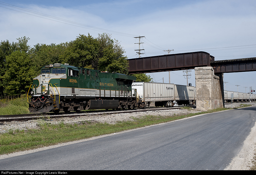 Southern Serves central Illinois? The Southern heritage unit leads the Detroit-Kansas City, Mo., TripleCrown "RoadRailer" in the Sangamon County village of Curran, 10 miles west of the state capital Springfield, on September 21, 2016. The train is going under the old Chicago & North Western "SI" Line, which then became the Union Pacific Madison Subdivision following the merger of the two railroads in 1995 until that portion of the line was abandoned in 1998.