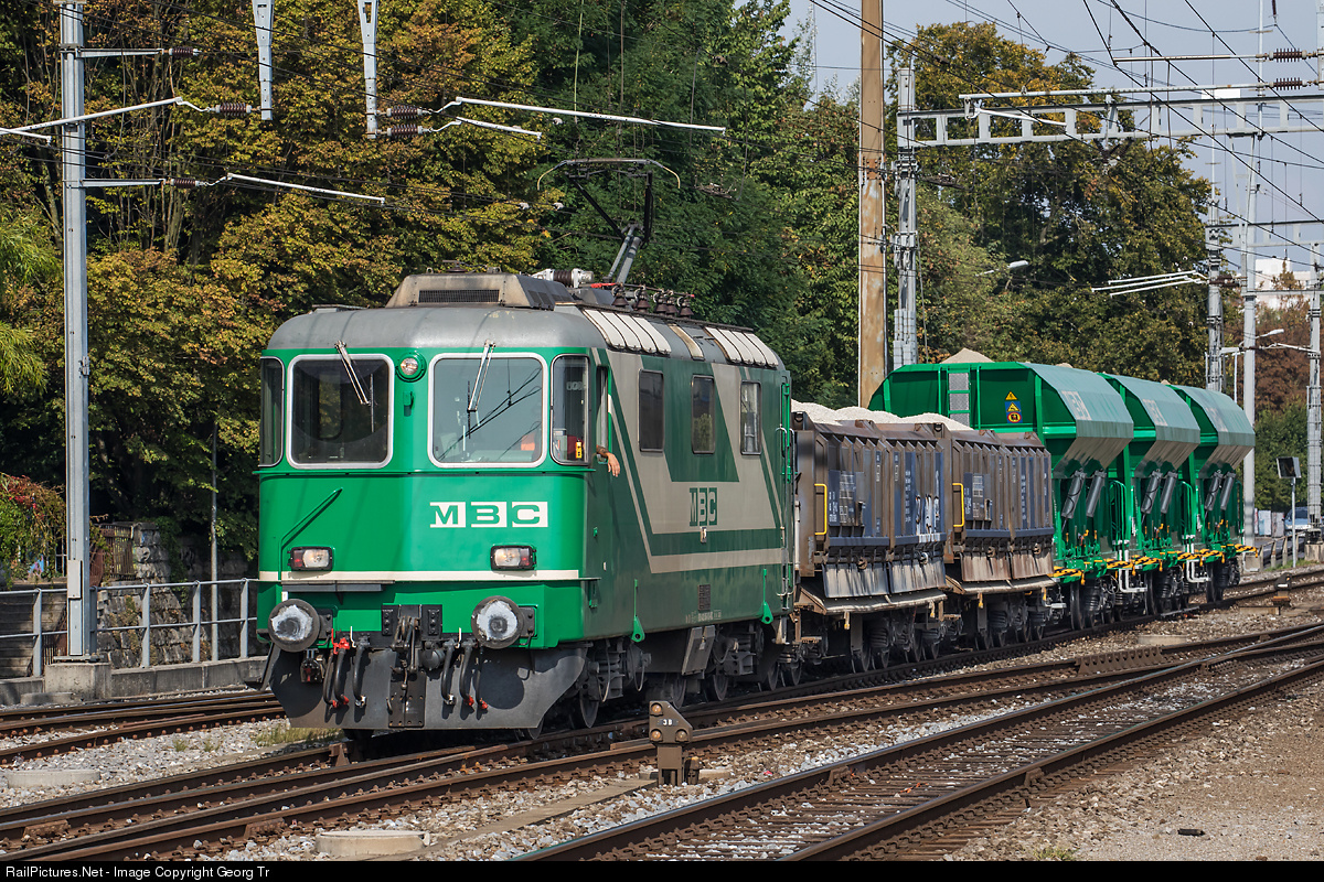 | Gravel and sand train of the MBC (standard gauge) from Morges to Gland, with locomotive Re 420 # 506, which was bought from the BLS in 2013. It is the former SBB Re 4/4 II # 11142, which was sold to the BLS in 2004. |
