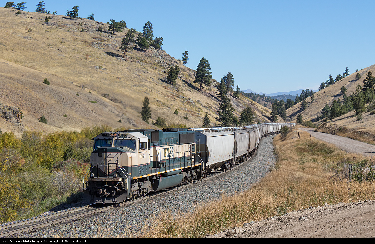 A recently reactivated SD70MAC brings up the rear of eastbound BNSF grain empty descending Mullan Pass on the MRL's 3rd Subdivision.
