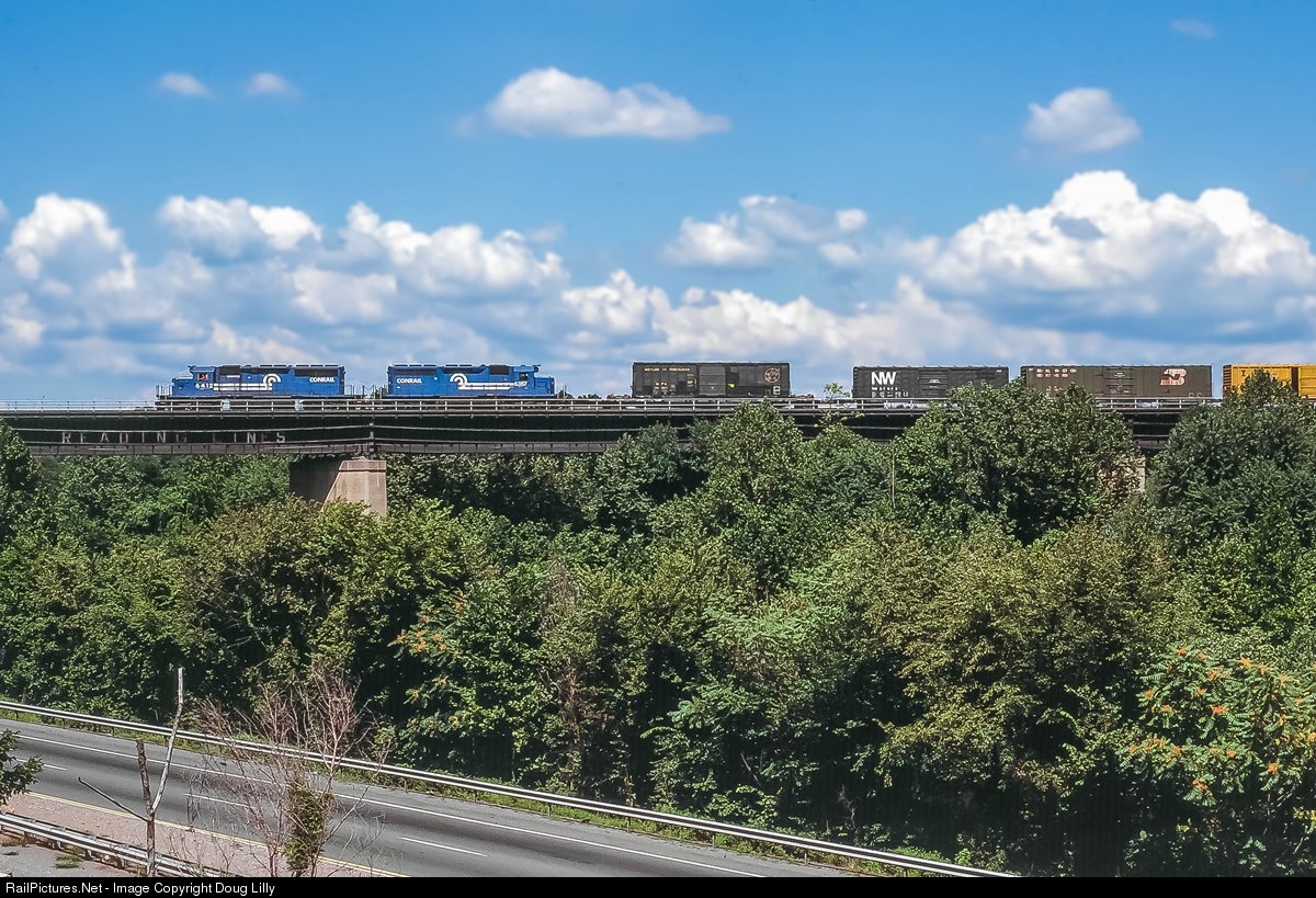Twin SD40-2’s lead a train west over the Schuylkill River on Conrail’s Lebanon Valley Line, on a bridge that still bears the lettering, “Reading Lines”, which was the logo of its previous owner, Reading Company. That Ma & Pa boxcar is on a flat along with its trucks, apparently on its way to York for repair or salvage by its owner.
