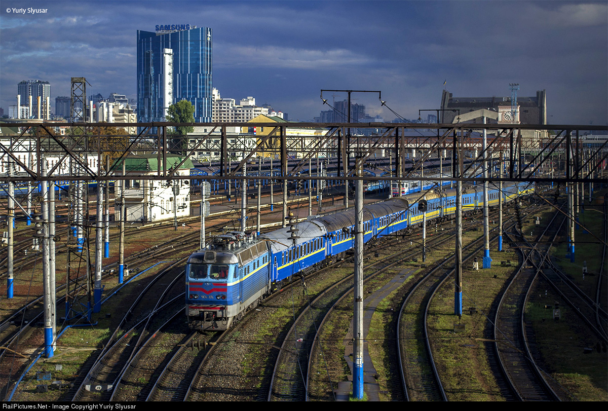 The electric locomotive CHS4-174 departing with double train #67 Kyiv - Warshaw / #767 "Stolychyi Express" Kyiv - Kovel. This electic locomotive built by Škoda in October 10, 1970 (serial type Škoda 52E4, serial number 5805). Since 1970 to 1980 this locomotive was registred to depot TCHE-8 Kirov (Gorkovskaya Zheleznay Doroga (Gorkovskaya Railway) now was subsidiary of Russian Raliway (RZD), then they was transmissed to depot TCH-1 Kyiv-Pasazhyrskyi (Pivdenno-Zakhidna zaliznytsya was subsidiary of Ukrzaliznytsya (Ukrainian Railways). In October, 1990 this locomotive was modernized on Zaporizhia electric locomotive repair plant (ZERZ) with replace body from laminate to steel (approximately how he looked before modernization (Photo ID: 489154). Three first passenger cars (type RIC) of train #67 Kyiv - Warshaw was leading to Kovel' station on bogie of track 1520 mm., then was rapleced bogies of european (standard) gauge 1435 mm. I was taken this photo from Povitroflots'kyi overpass (Povitroflots'kyi Ave). In those day was rainy weather, and my was lucky taken few photos when was sun light, in the bacground can see storm sky.