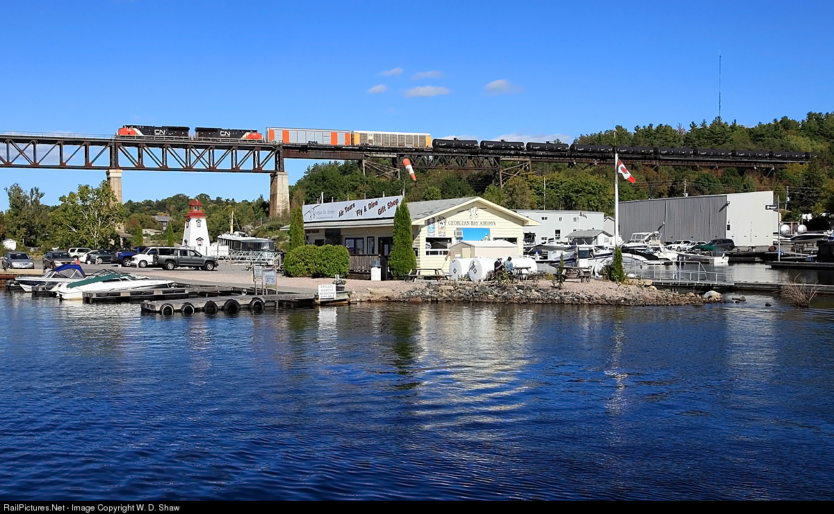 | Attended a wedding in Parry Sound this afternoon, got there early to see if I could catch anything going over the harbor on the CP trestle. Missed the first one by a stoplight, but caught this one about 1/2 hour later. |