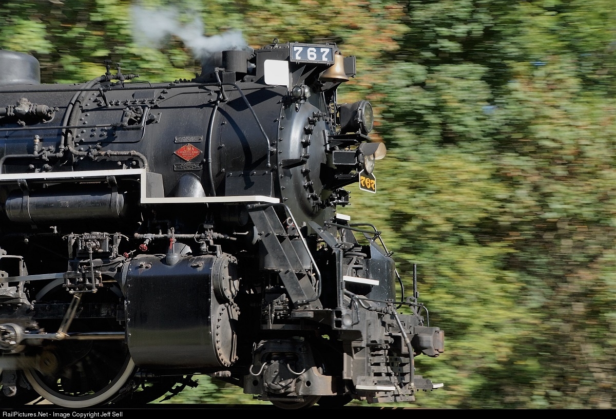 Pan shot of NKP 765 temporarily renumbered as NKP 767 and sporting a classic NKP front end look complete with a Mars headlight.