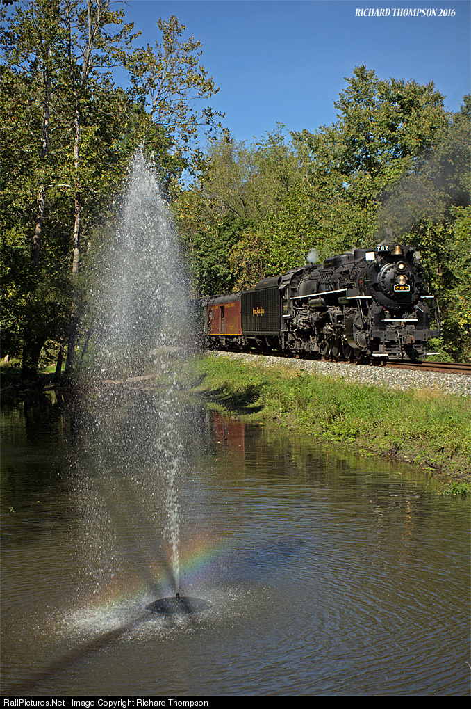 | NKP 765 (numbered as the 767) is riding at the tail-end of the northbound excursion train as it rolls past the fountain at Botzum Farms in Botzum, Ohio. A neat rainbow effect had appeared in the fountain just in time for the train's passage. |