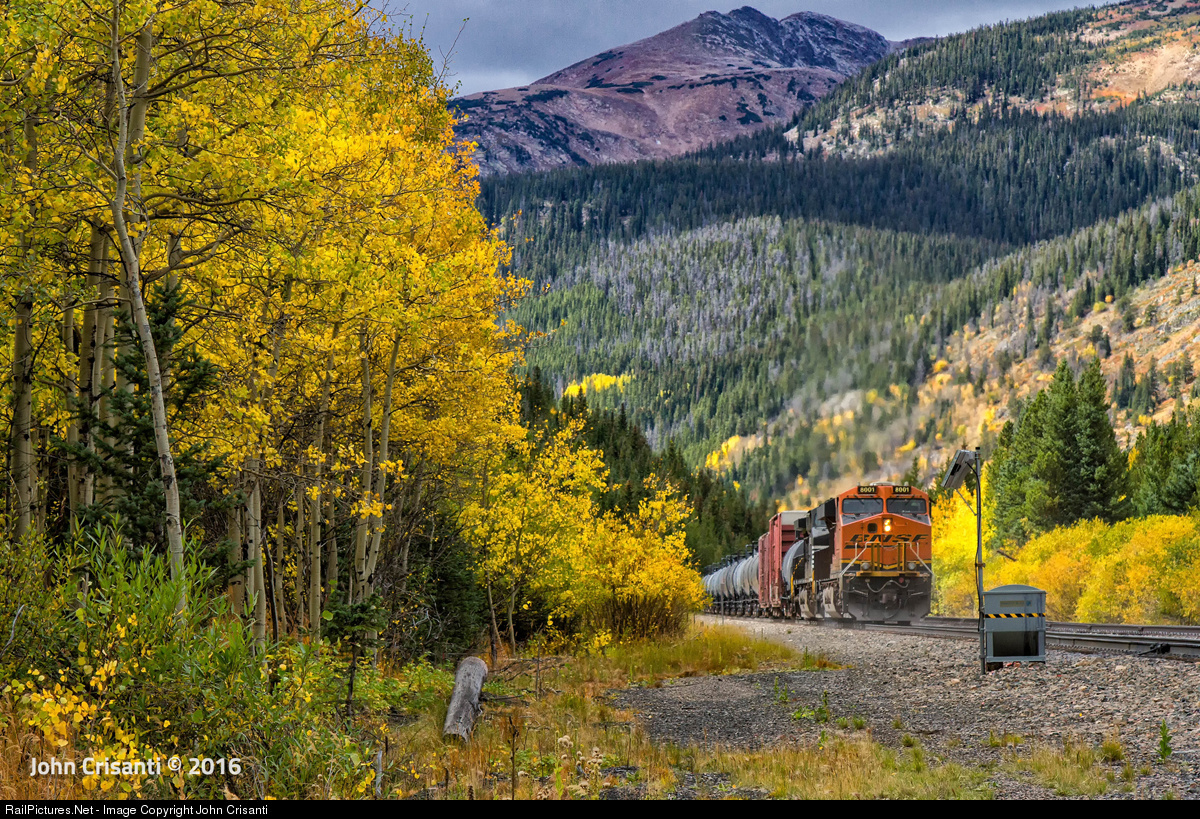 | BNSF ES44C4 No. 8001 and NS C44-9W No. 9174 help shove a lengthy westbound BNSF trackage rights manifest up the 2-percent grade at East Portal, Colorado on September 24, 2016. The train has less than a mile before reaching the Moffat Tunnel.