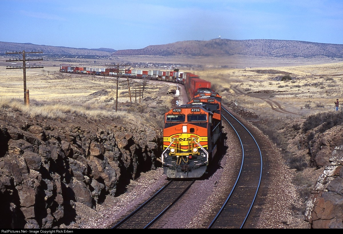 | During the years that my son attended college in Laramie, WY we took a one week Spring Break tour along the Transcon. These were great times and we'd spent the night west of Seligman sleeping between the tracks and old Route 66 as the flow of rail traffic roared beneath Arizona stars. Next morning we are halfway between Seligman and Crookton as the 4726 East has blown through the old division point of Seligman and is now assaulting the lengthy grade over the Arizona Divide. |