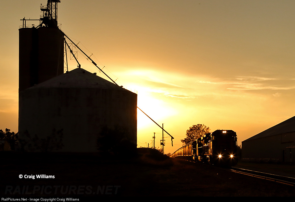 A loaded grain train out of Ida Grove, IA, bound for Helvetia, LA, for unloading, rolls east on the CN Dubuque Sub at sunset. The train is seen here passing thru Masonville, about 40 miles east of Waterloo with a standard cab dash 8 leader.
