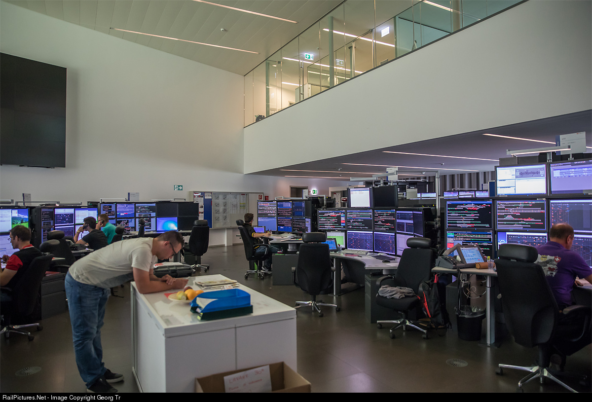 View into the control room of the Centro d'Esercizio Pollegio (CEP) (operation center Pollegio) of the SBB. From here, the Gotthard line from the borders to Italy, via the mountain and Base Tunnel lines to north from Arth Goldau is operated, supervised and controlled. Additionally, all the technics of the Base Tunnel is operated and the vehicles and staff of the TILO company (SBB daughter for the regional traffic in the Ticino and to Italy) is controlled.