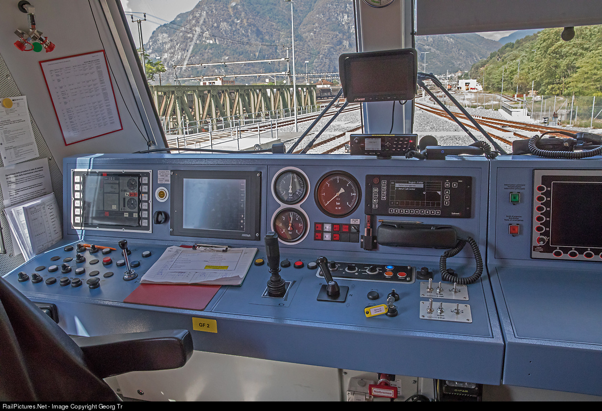 | Cab of the self propelled fire-fighting and rescue train "LRZ14" of Biasca, based in the EIZ (maintenance and intervention centre) for the Gotthard Base Tunnel and the mountain line. The screen up in the middle is of the thermografic camera, mounted in front of the vehicle. |