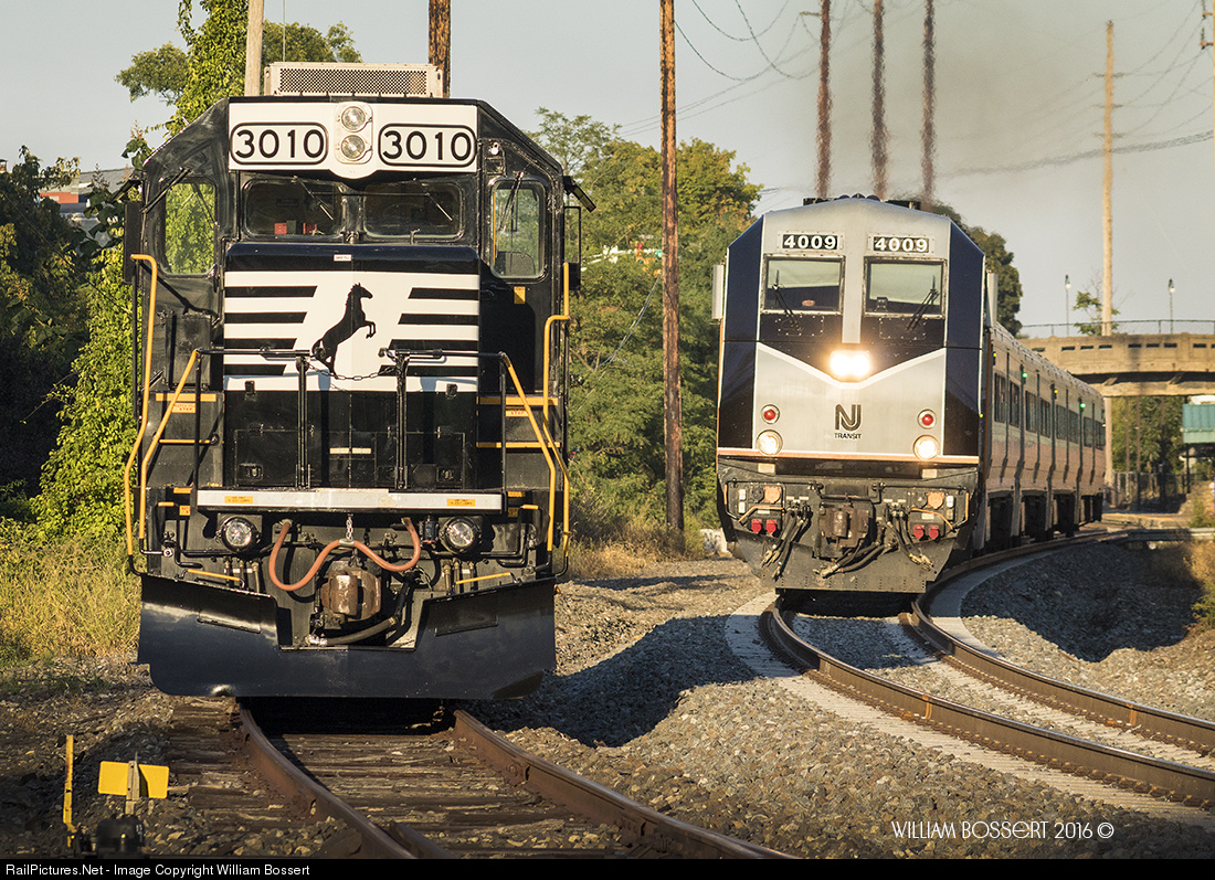 The NS-H02 crew were outlawed at Boonton NS with engine 3010 sitting static on former Westbound track now a yard track at the former Lackawanna Boonton freight yard taking in the final minutes of the early evening autumn light as New Jersey Transit Train#1079 with engine #4009 at the point and 6 cars powers up the grade west having just left the Boonton station. |