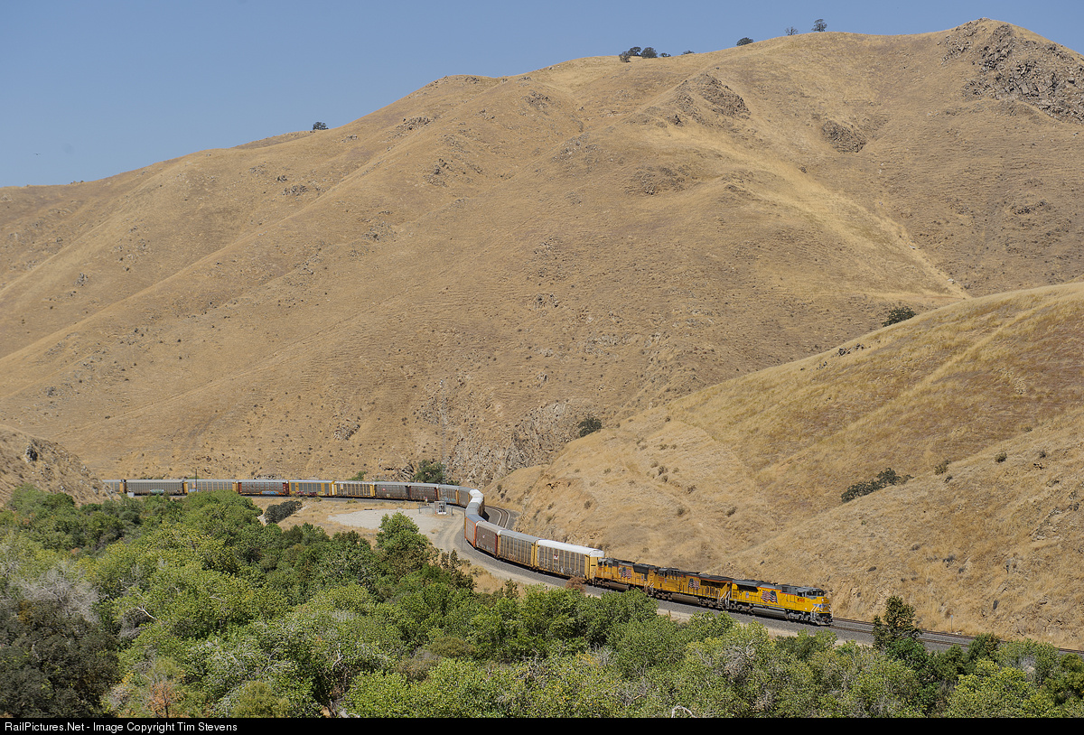 A clean UP SD70ACe has the point of a southbound UP vehicle train, just about to begin the climb over Tehachapi Pass.