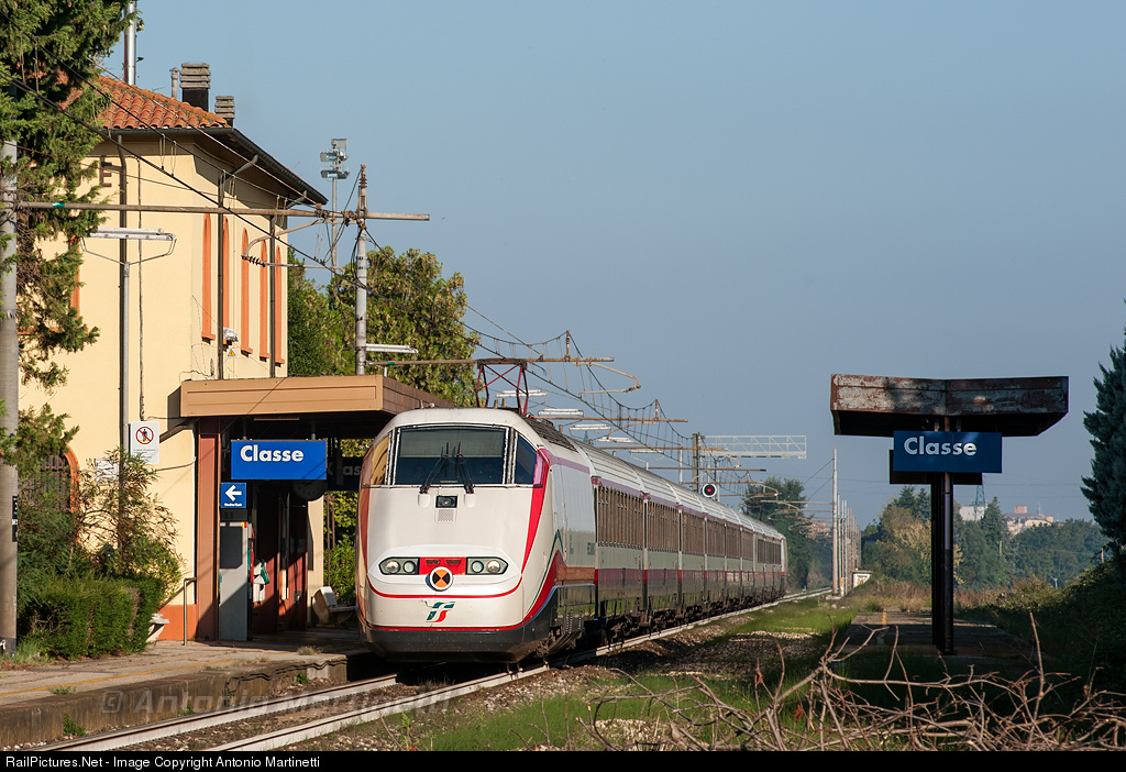 | During the weekend 24/25 September 2016, works on the mainline between Bologna and Rimini required diversion of long distance services on the secondary Ferrara-Ravenna-Rimini line. A Venezia-Lecce Frecciabianca is passing Classe, just south of Ravenna. |