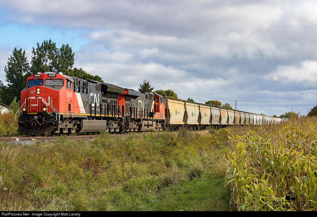 POTASH & CORN CN 3068 leads a morning Canpotex Potash train along the Sussex Subdivision, as they head through Sussex, New Brunswick, destined for Saint John, New Brunswick. This train set off 72 potash loads at Joffre, QC, and are running with 133 cars, with two rear DP's.