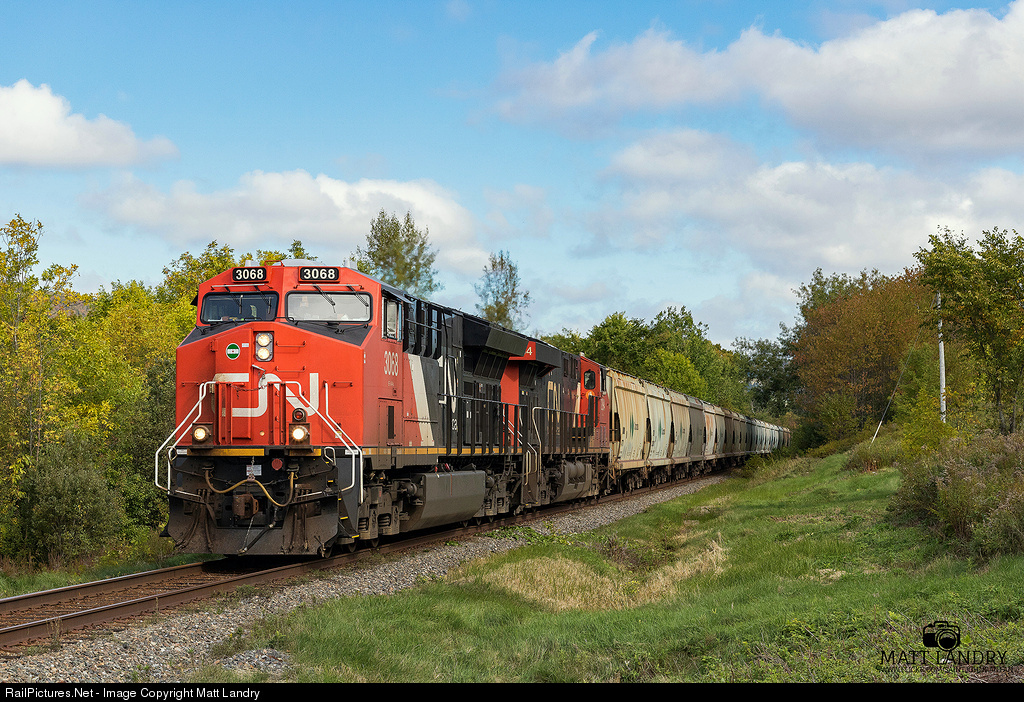 CN 3068 leads a morning Canpotex Potash train along the Sussex Subdivision, as they approach the town of Hampton, New Brunswick, destined for Saint John, New Brunswick. This train set off 72 potash loads at Joffre, QC, and are running with 133 cars, with two rear DP's.