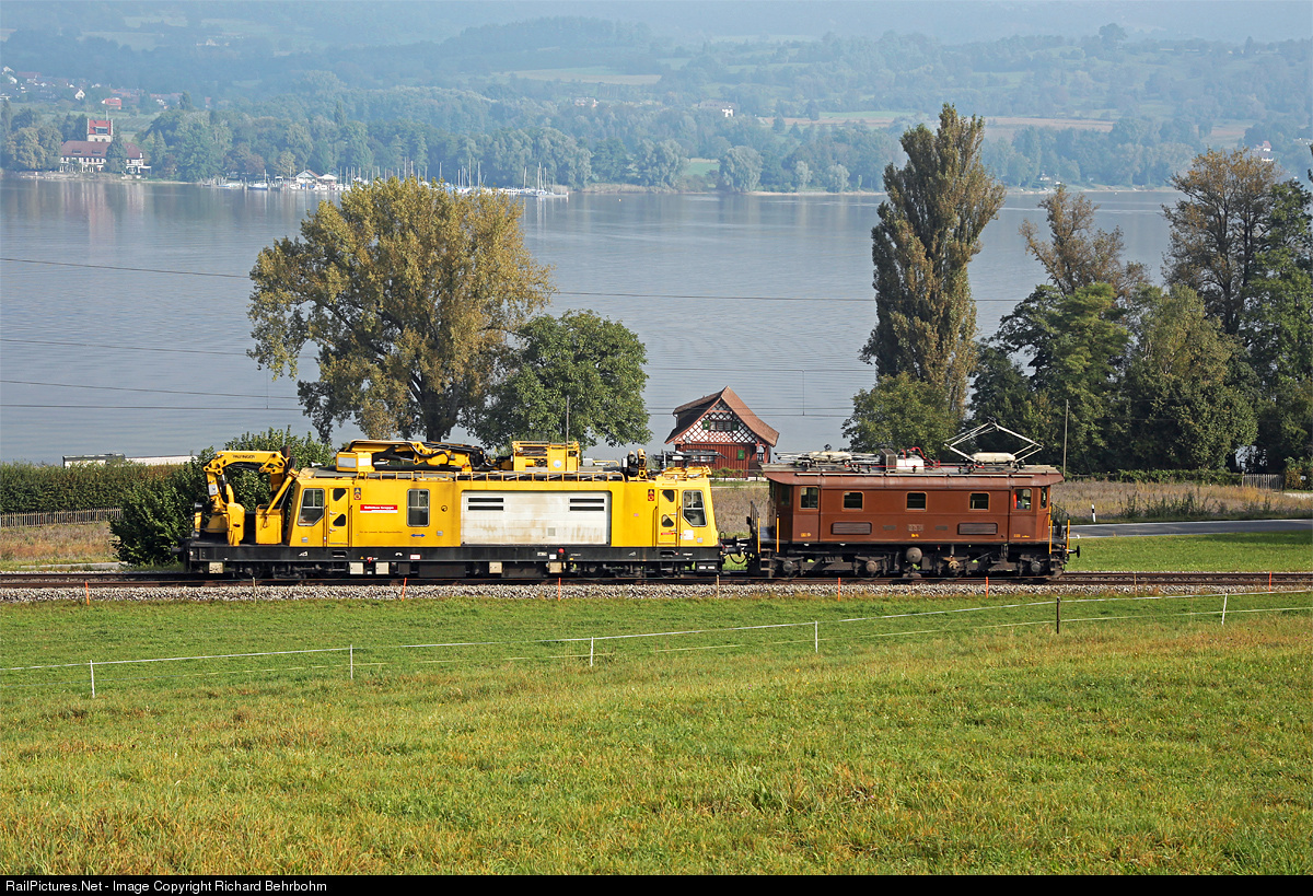 | The historic Be 4/4 14 of Eurovapor Lokremise Sulgen, built in 1931, is pulling a German rail vehicle "OMF 001" for catenary works. |