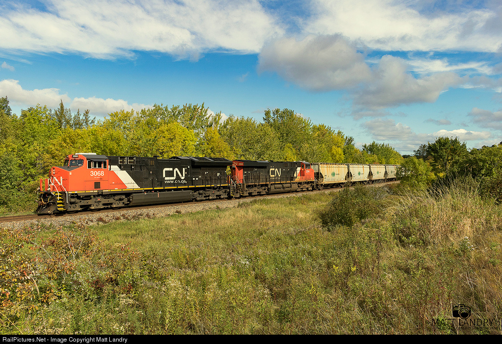 CN 3068 leads a morning Canpotex Potash train along the Sussex Subdivision, as they head through Nauwigewauk, New Brunswick, destined for Saint John, New Brunswick. This train set off 72 potash loads at Joffre, QC, and are running with 133 cars, with two rear DP's.