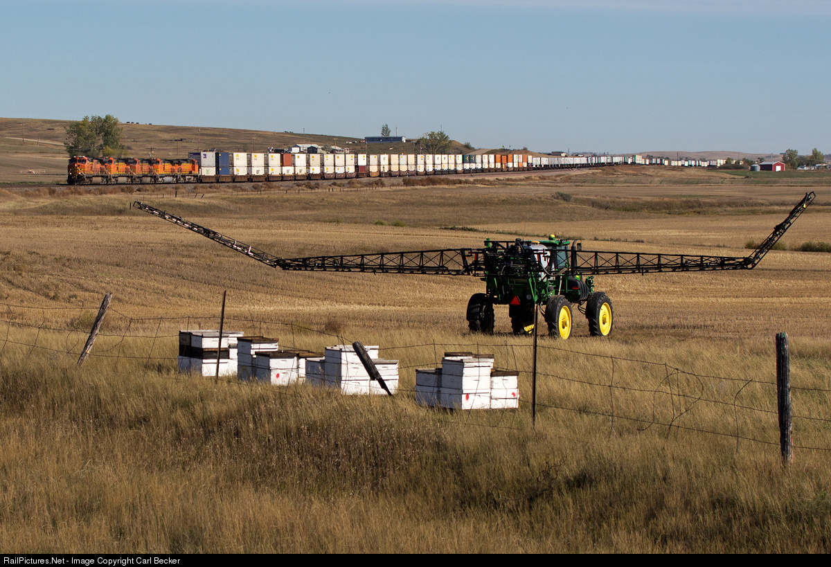 A farmer works his field as a five-pack of GEs zips an intermodal train westward toward Williston.
