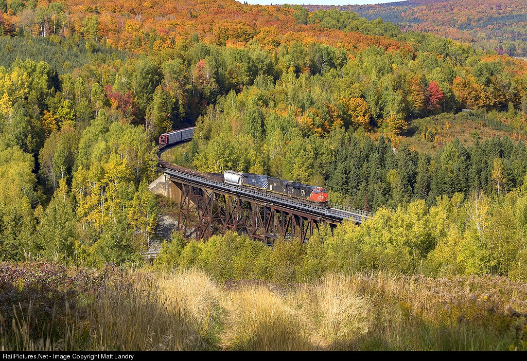 With the Fall season under way, CN 2344 leads eastbound train 'M306', as they negotiate the curves and grades of the Pelletier Sub. Seen here sticking their train out from the trees to cross the trestle at St Eleuthere, PQ.