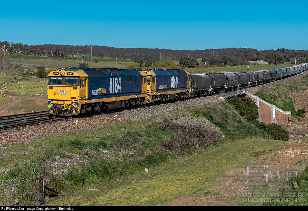 | On Sunday morning, October 2, Pacific National grain train - symbol 3938 - is seen eastbound at Joppa Junction with pair of matched 8100-class units in the Pacific National Railway scheme. |