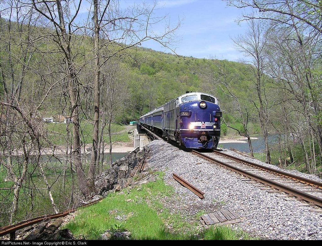 Potomac Eagle F units 722 nears the end of it excursion through the "trough", with the Hagerstown Roundhouse Museaum Special in tow.
