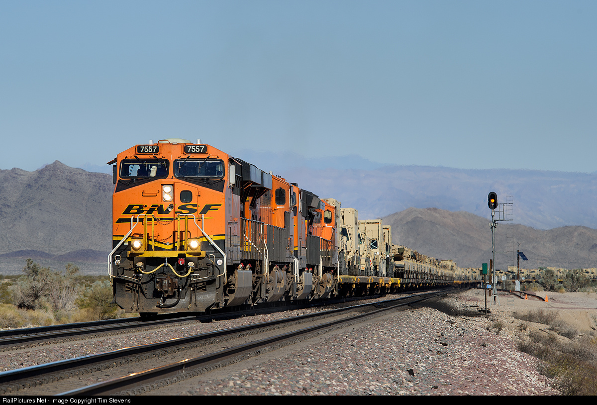 BNSF ES44DC 7557 leads a loaded military train westbound on the Needles Sub.