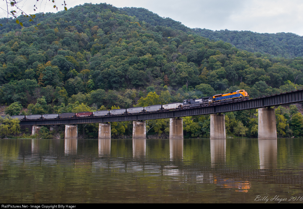 | KN39 crosses the Kanawha River trestle at Deepwater, with the Jersey Central Heritage on point. This stretch, formerly the northern end of Norfolk Southern's Princeton-Deepwater District, was part of the trackage leased out to Watco between Elmore and Columbus. |
