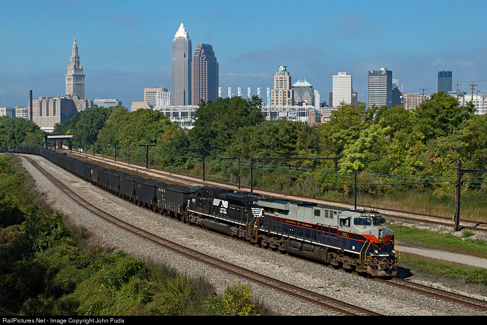 Loaded coke train 888 heads east of the former NKP as the Central of Georgia heritage unit leads the train on a beautiful fall day in Cleveland.