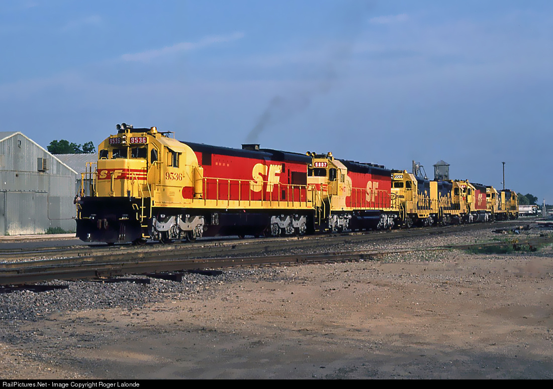 Santa Fe merger painted SF30C 9536, along with SD45-2 5807 and SD45-2 5811, at Cleburne, Texas in August 1987.