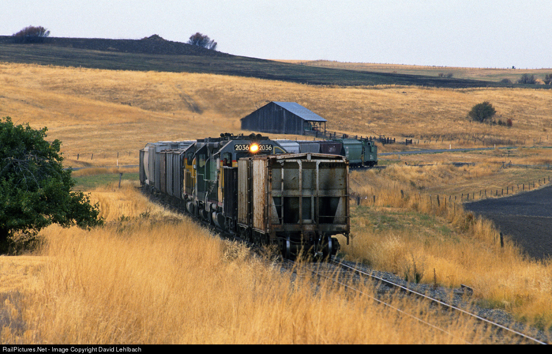 Exactly 20 years ago today, 10/4/1996, the train crew of Camas Prairie train 63606 is approximately 6 hours into their day. At Cottonwood, the crew set out some grain hoppers and ran around their ballast loads. They are now ready to dump ballast South of Cottonwood, shoving the loads yet bringing their train with them. In a mile they will cut away from the train on the mainline and dump ballast for the MOW crew who is now awaiting the train's arrival. This is classic PNW branchline railroading at its best, with one train every few days. The Camas Prairie Railroad was a jointly owned and operated railroad between UP and BN, until it was sold to a shortline in 1998. This stretch of the railroad is now gone - all of the rail has been removed.