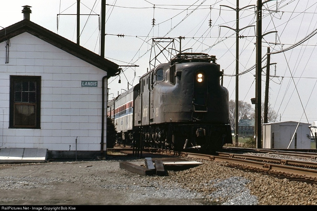 The Broadway hits the old Reading & Columbia diamond at a good mile-a-minute on its way to points east. The block station, housing a five-lever machine, still displays its classic Deepwater Green Penn Central sign. There weren't too many places on the old PRR electrified lines that featured 90-degree crossings; this and Lemoyne are the two that come to mind.