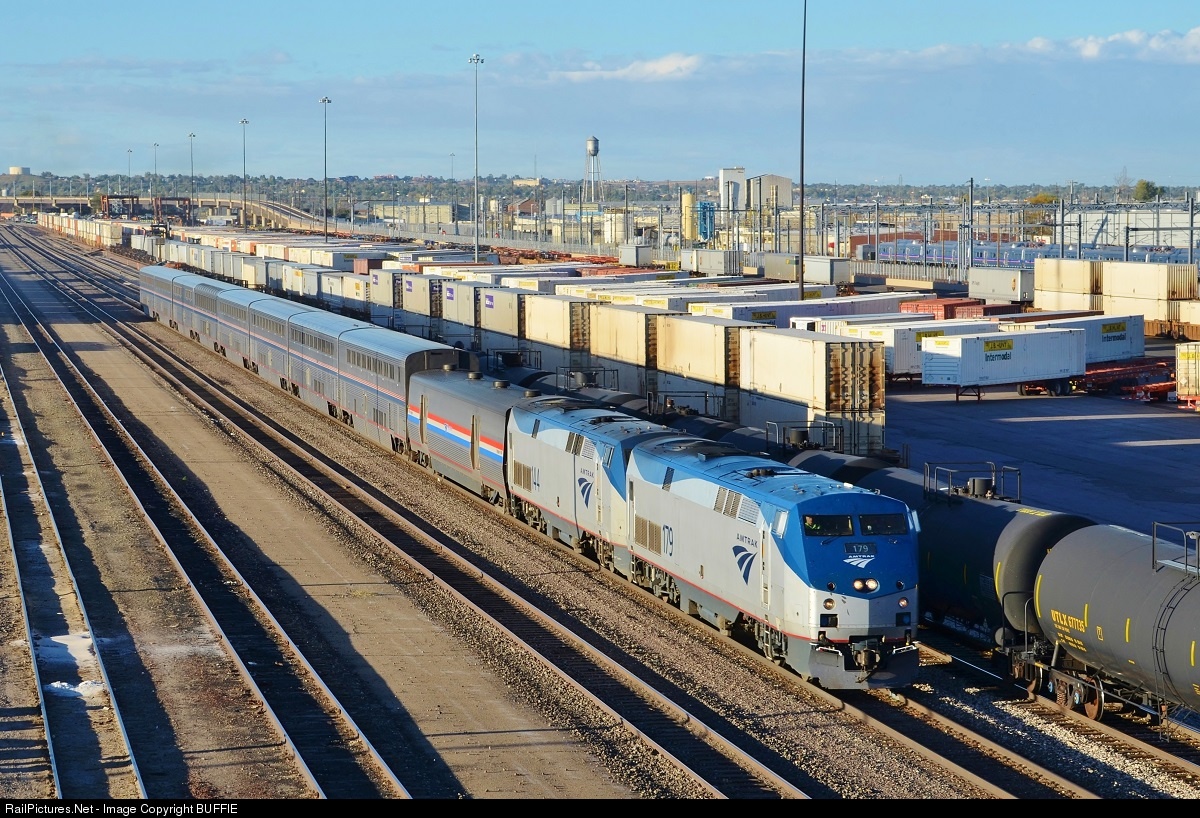 The evening California Zephyr runs by the North Yard and the BNSF's intermodal facility on its way to Denver Union Station.