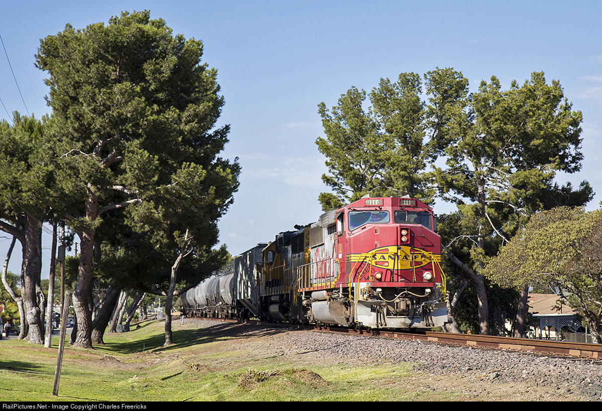 | The First Watson job climbs Monoco Hill on its way between refineries (having just worked Chevron in El Segundo and about to work the Torrance Refinery in Torrance). Apparently this is one of the last Santa Fe lettered GP60Ms left. |