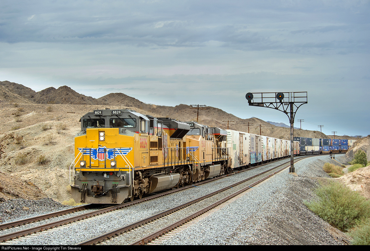 UP SD70ACe 8829 leads a Los Angeles, CA-New Orleans, LA Z train east on the Gila Sub, passing under a classic SP cantilever. The train will be handed off to the CSXT in New Orleans for the remainder of the run to Jacksonville, FL.