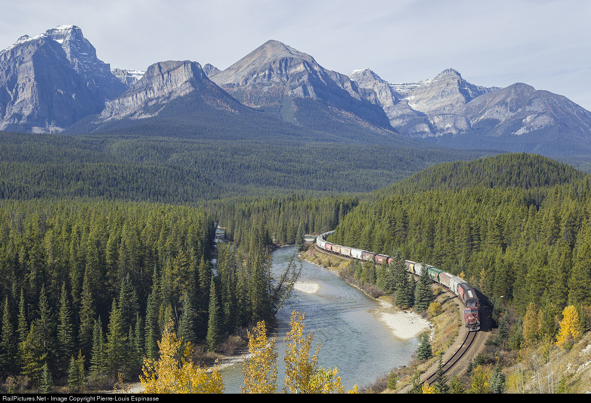 | CP 9761 operating as a DPU for a westbound grain train along Morant's curve just east of Lake Louise, AB. The train is ascending Kicking Horse Pass along the Bow River and soon will descend through the Spiral Tunnels to Field, BC. |
