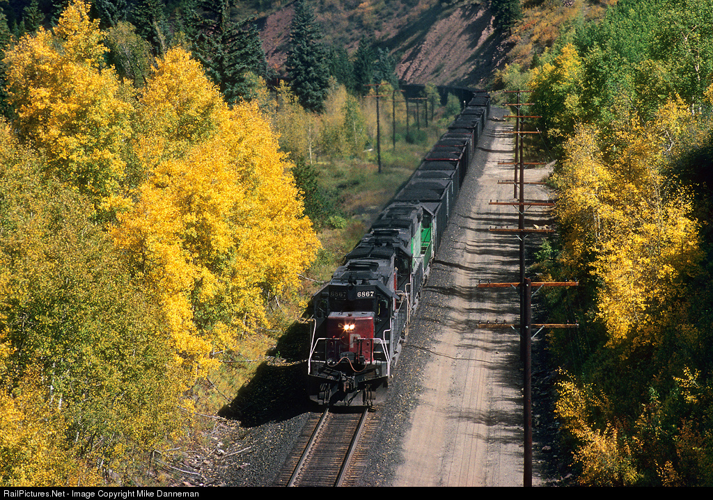 During some early autumn colors, an eastbound Southern Pacific coal train climbs the steep west slope of Colorado’s Tennessee Pass out of Minturn at a location once known as Rex on September 8, 1992. Two SP SD45T-2Rs (Nos. 6867 and 6854) are assisted by BN SD40-2 No. 8125 on the point of the heavy train pounding up the 3% grade.