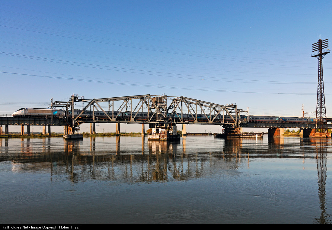 The Portal Bridge is an anachronism on the Northeast Corridor, and it seems even more so with an Acela consist passing through it. This bridge has been in service for nearly 106 years as of the time of this photo. It was placed in service by the Pennsylvania Railroad in November 1910 and was expected to have a hundred-year lifespan. Portal handles a high volume of Amtrak and NJ Transit traffic each day and is considered to be the busiest railroad bridge in the Western Hemisphere. This double track swing bridge is also a "weak link" and choke point on Amtrak's Northeast Corridor, as it is subject to failures which cause cascading delays to rail traffic. Portal is scheduled to be replaced in the near future. |