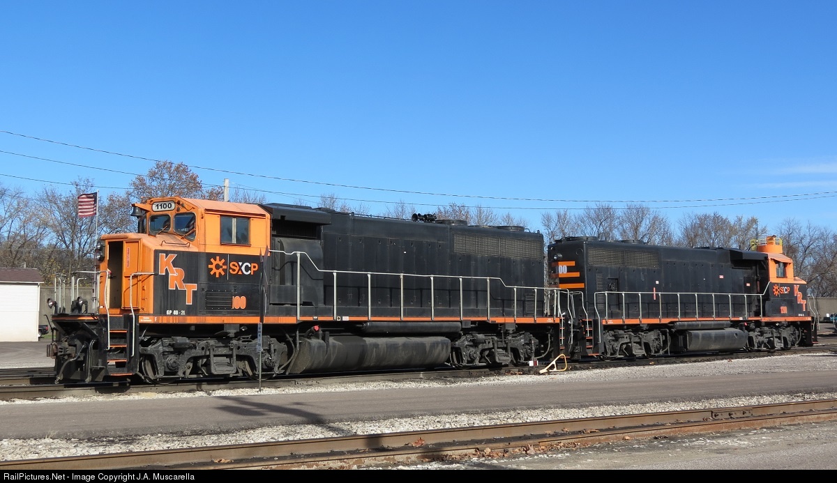 | The classy American Flag flying, Halloween colored, KRT locomotives pause for a brief rest in their yard. |