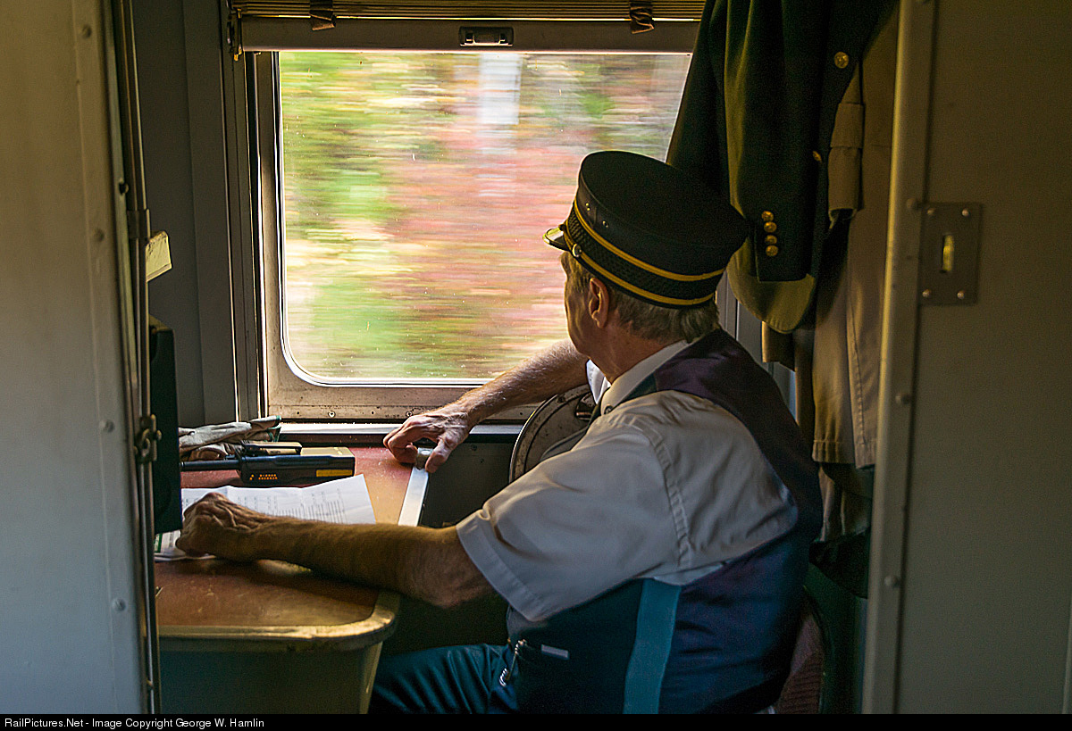 Conductor at work aboard a southbound CN passenger special, using passenger cars from the Lake Superior Railroad Museum's collection