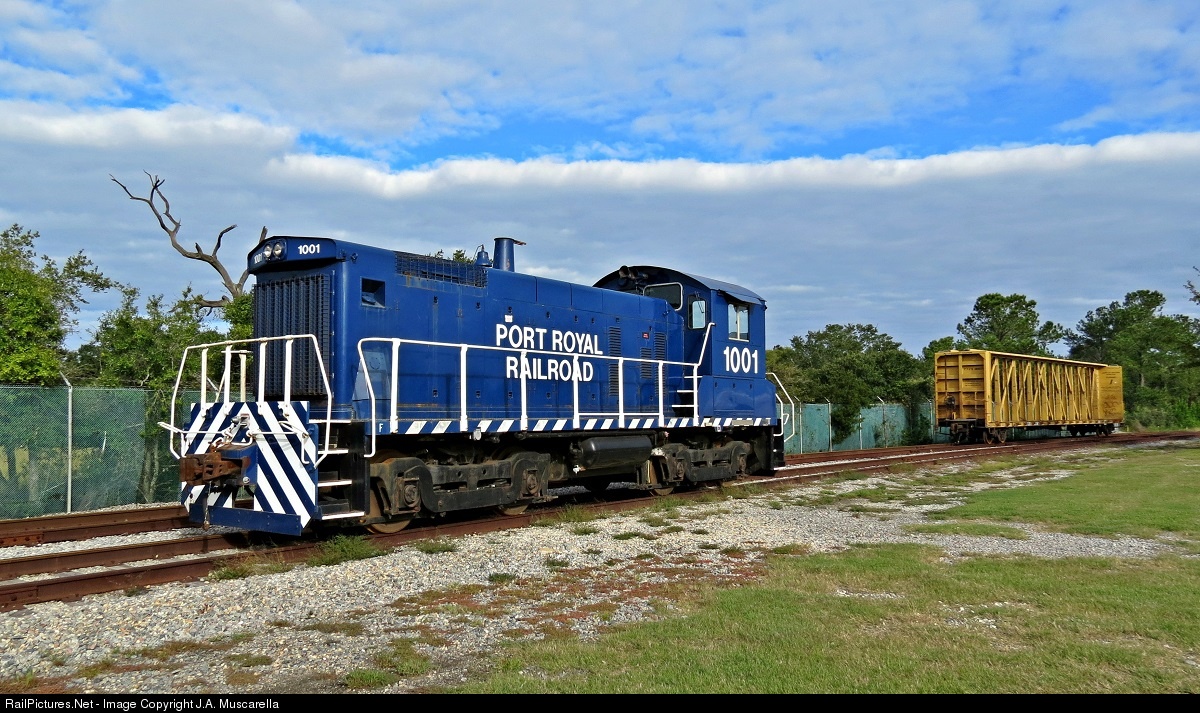 | Palmetto Railways SW1001 sits quietly on the grounds of the old Navy Base this morning. It still wears the paint and letters of its previous owner, the Port Royal Railroad. This engine seems to stay around the old base and is used for switching various jobs that are now located on the old base. |