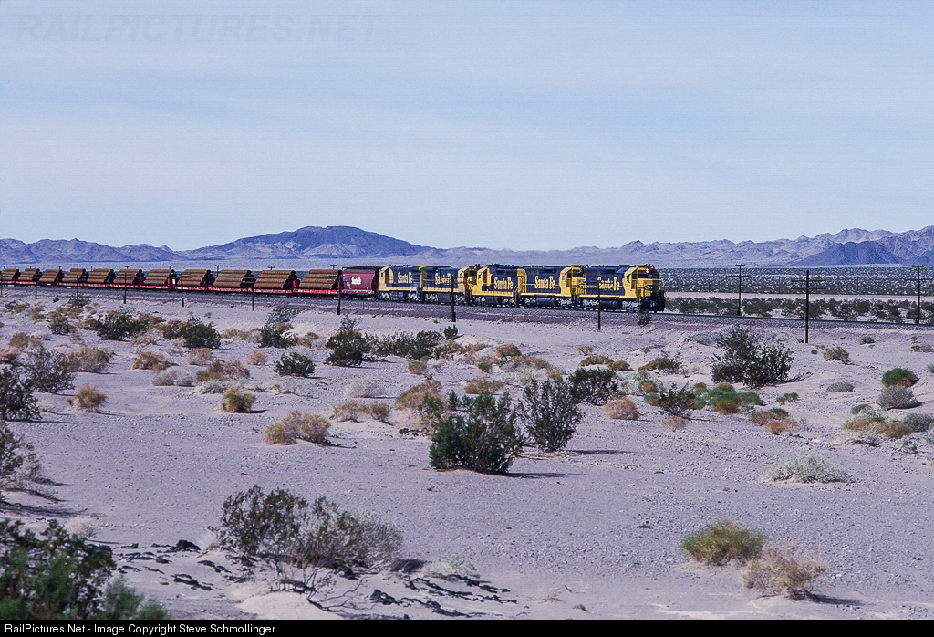 A pair of rebuilt SD45s leads an eastbound train of steel pipe across the Mojave Desert just west of Amboy.