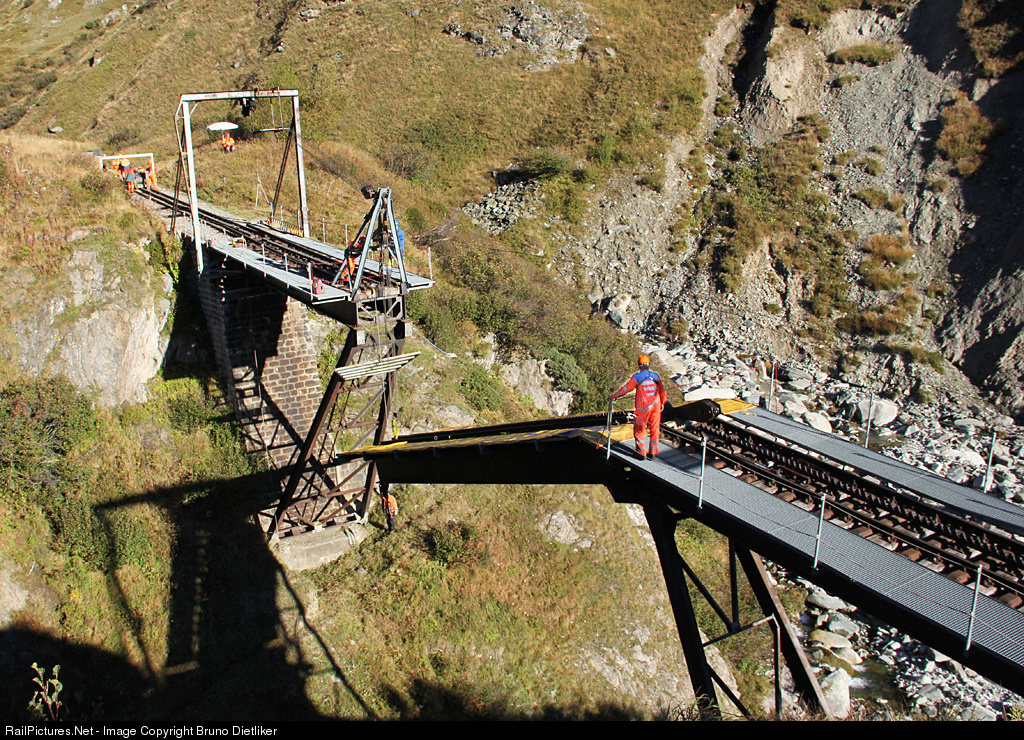 | Dangerous job: The 'Steffenbachbrücke' with cogwheel between Realp and Tiefenbach, a very special bridge with three parts. Every autumn about 15 volunteers hinge down this bridge in one day. Every winter a big snowslide comes through this small valley. First the middle part goes down to the valley. The yellow coverages protect the middle part. In the springtime the men construct the bridge again for the summer season of the steam company |