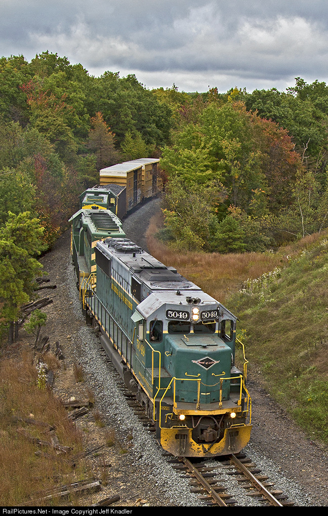| Autumn is in the air as the West Hazleton "Fast Freight" drops down the mountain into Lofty, PA. Three different models of EMD locomotives are leading the sizable train down the Hazleton Line on this gloomy Autumn afternoon. |