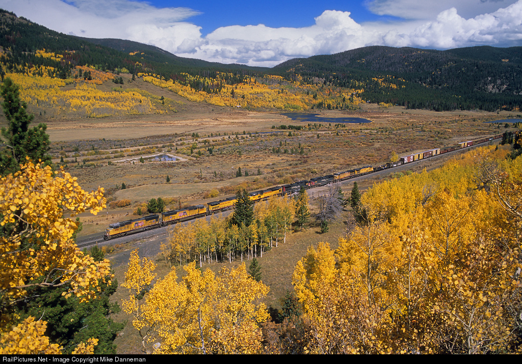 Union Pacific MNYRO rumbles through Tolland, Colorado, during the peak of autumn color on October 2, 2008. The westbound freight has eight locomotives up front, with two EMD SD70Ms leading a GE AC4400CW, a EMD SD9043MAC and four more GE AC4400CWs, including two former Southern Pacific units.