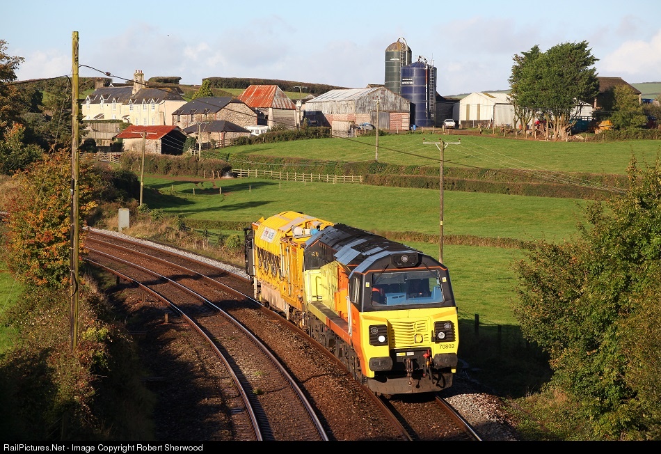 | Whiteley Farm provides the backdrop for 70802 and Railvac 4 passing Follaton working 6X54 08:54 Plymouth to Westbury on Sunday 16th October 2016 |