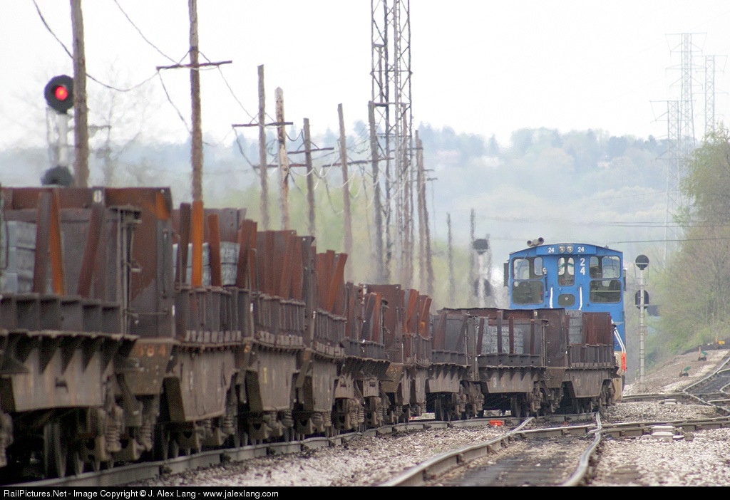 | The hottest train on the Union! Loaded steel slabs from USX Edgar Thomson works are headed for the rolling plant at Irvin, at right. The route to the left continues to the Clairton coke works. |