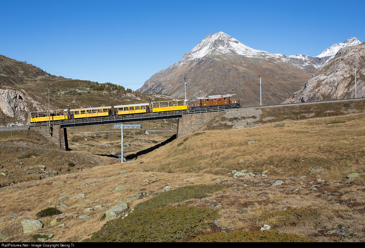 "Bernina Crocodile" Ge 4/4 # 182, built in 1927 by SLM and SAAS for the then independent Berninabahn (Bernina Railway), with train 2623 from Pontresina to Ospizio Bernina on the occasion of the 20 years "Club 1889" event. The cars are open observation B # 2096 (serves as protection car), C # 114 "La Bucunada", BC # 110 and the rather full open observation B # 2100. The train is crossing the Ova da Bernina creek on the Alp da Buond near Bernina Lagalb, with Piz Albris in the background.