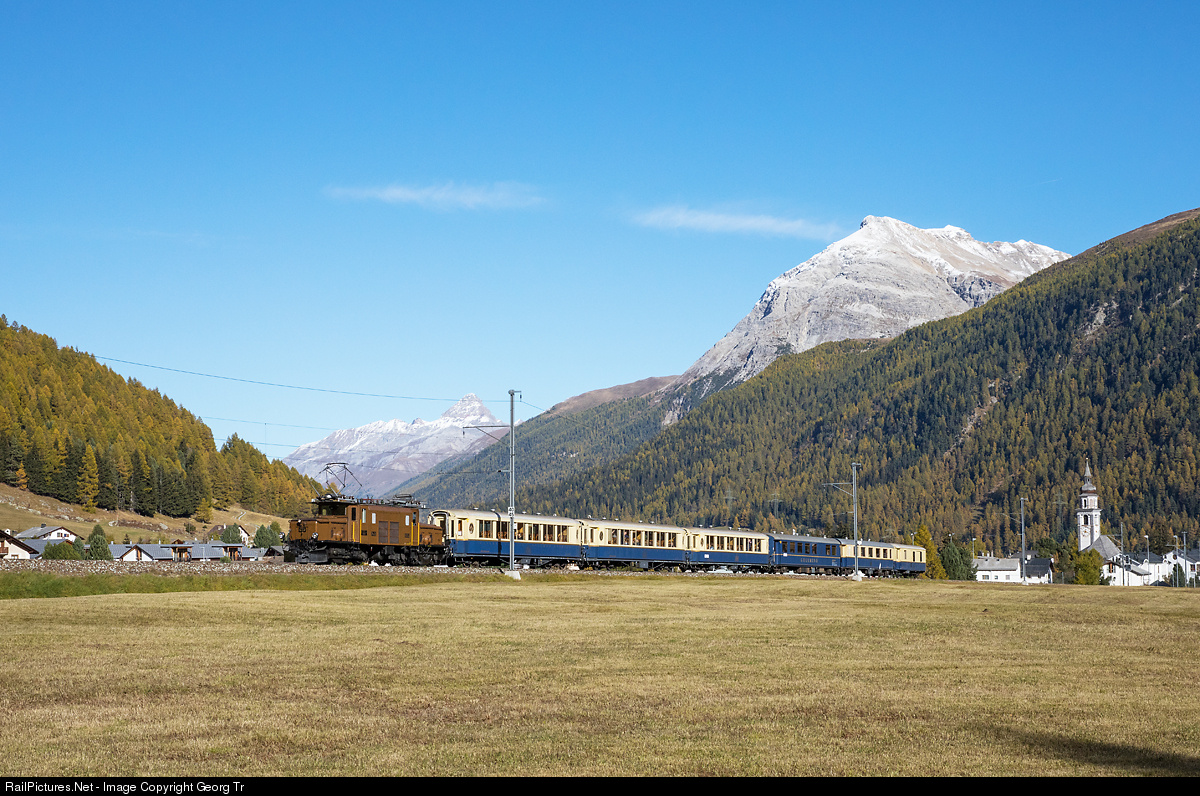 The "Rhaetian Crocodile" Ge 6/6 I # 415 is pulling the ENGADIN EXPRESS 2170 from Samedan over the Albula line to Chur and entering the Bever valley. The locomotive is pulling the saloon cars As # 1144, # 1143, # 1141, restaurant car WR # 3913, saloon As # 1161 and baggage car D # 4051.
