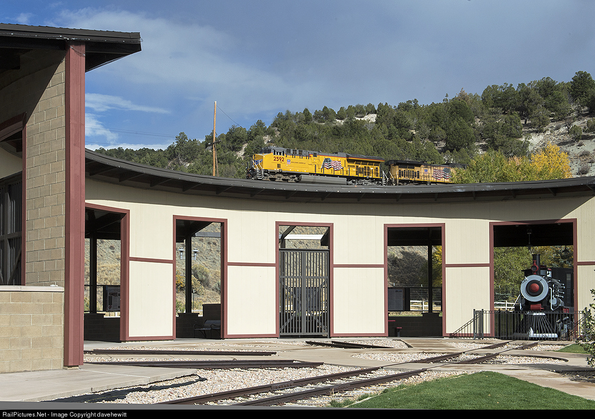 | One of my favourite things about the USA are the rest areas. They always seem to be a place of outstanding beauty or have a story to tell. I came across this one on Highway 6 out of Provo. Designed in the shape of a roundhouse it houses displays about the history of the area and how it developed over time. The model locomotive is a work of "ART" and could never have run in a million years but is a nice touch nevertheless. A frieight runs overhead on the way to Soldier summit |