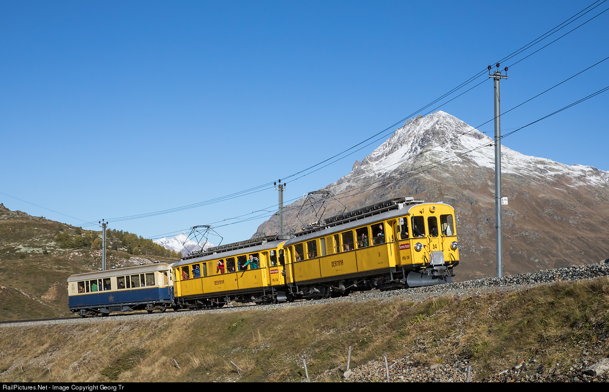 | Electric railcars ABe 4/4 # 34 and # 30 "The Yellows" or "Kessler Zwillinge" in multiple with Piano/Bar car WR-S # 3820 on the journey from Pontresina to Ospizio Bernina, on the Alp da Buond between Bernina Lagalb and Ospizio Bernina. |