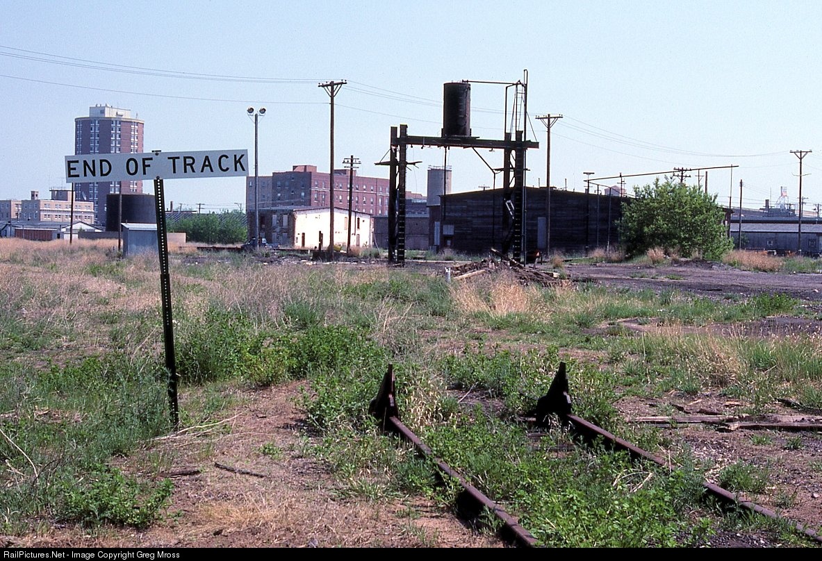 The sanding tower is all that is left of the once sprawling engine facility in Escanaba in June of 1988. The engine facilities were moved to the ex-P&H complex west of here and the tracks no longer have a need to go past the end of track sign......
